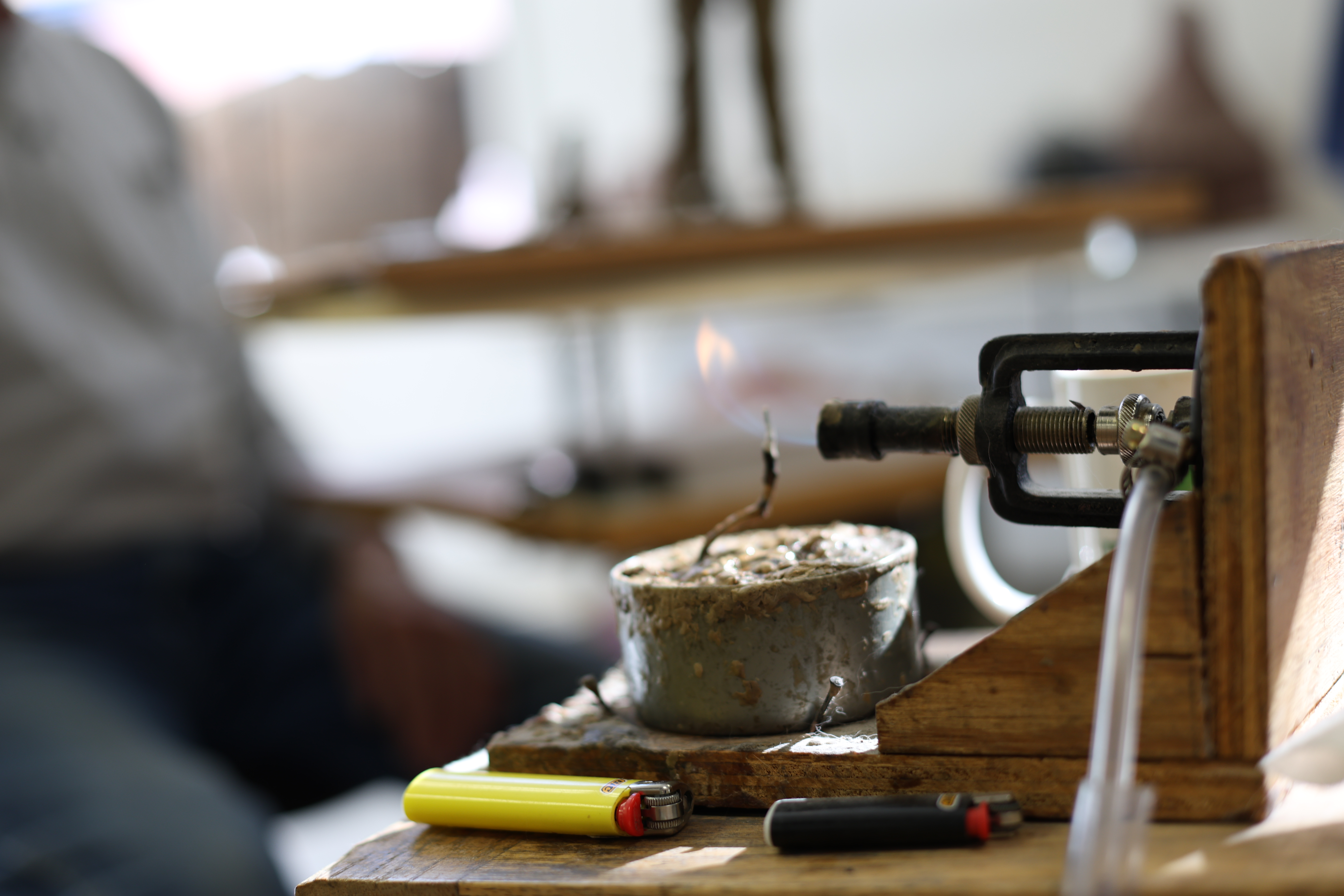 Once the bronze has cooled and hardened, the shell is carefully cracked away from the hardened bonze interior and the sprues are cut off the sculpture with a welding torch. In the case of the large sculptures that have been cast in separate pieces, the foundry welds all the elements back together to assemble the final work. The final touch is to dip the sculpture in patinas, different combinations of chemicals to create the various finishes on the final piece.